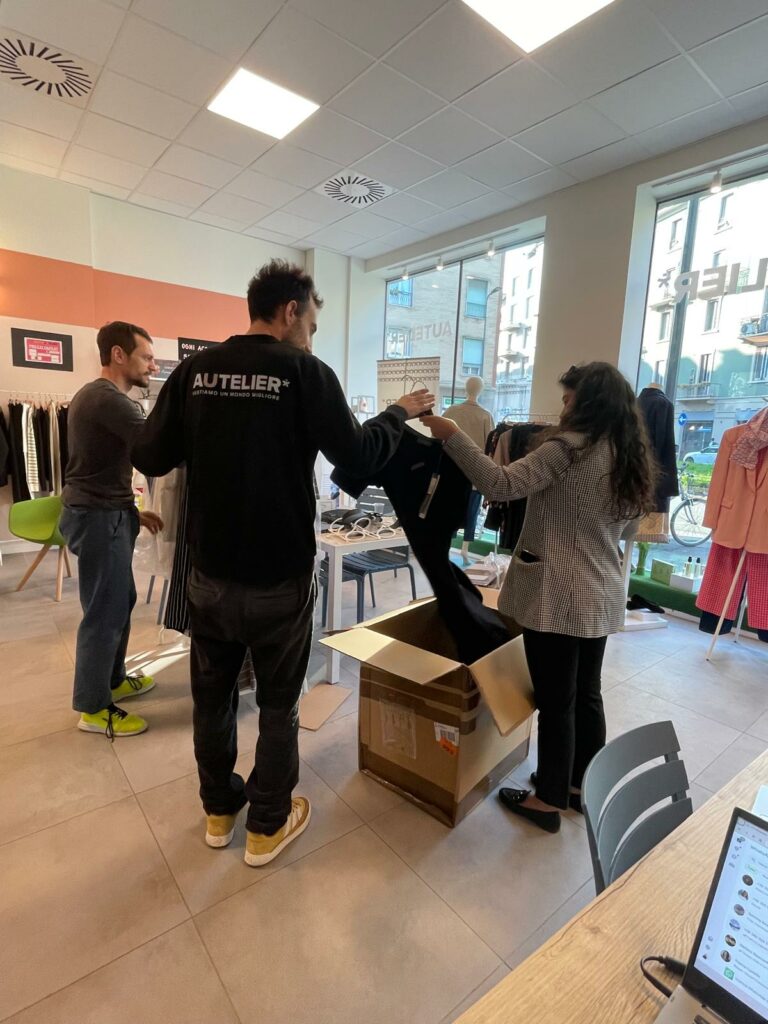 Oggi, in occasione della Giornata mondiale per la consapevolezza sull’autismo, vogliamo raccontare un pezzetto di quotidianità dei ragazzi di AUTelier, qui nella nostra boutique. Ogni giorno il loro lavoro segue un percorso preciso, costruito passo passo insieme ai tutor e agli educatori: si comincia tirando fuori i vestiti dagli scatoloni, uno a uno, per catalogarli. Ogni capo viene stirato, osservato, e preparato per entrare nello spazio vendita secondo un metodo chiaro e condiviso.